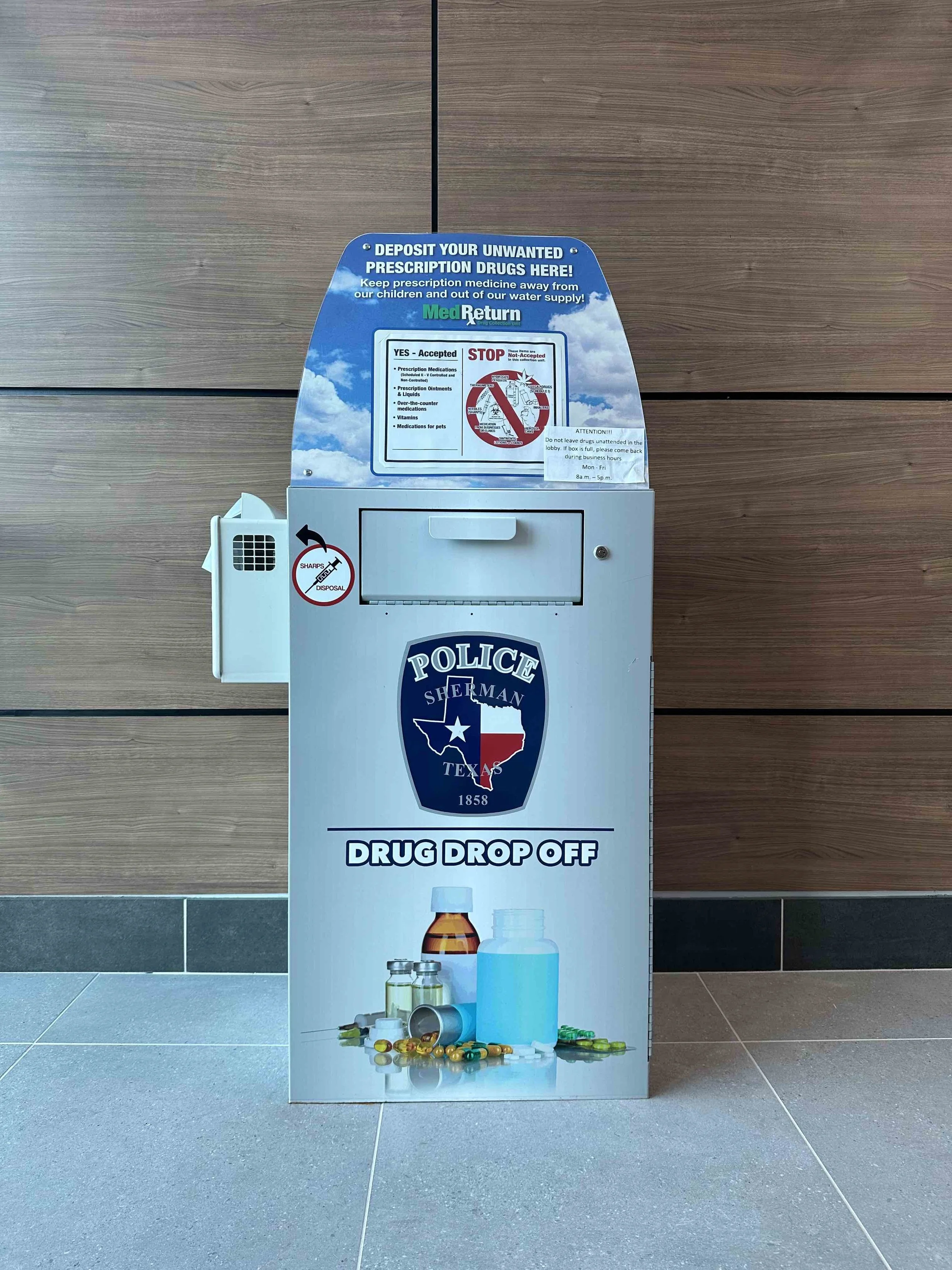 The Sherman Police Department now has an easy-to-use community drug collection receptacle located in the lobby of Police Headquarters at 2600 West Travis Street, Sherman, Texas.